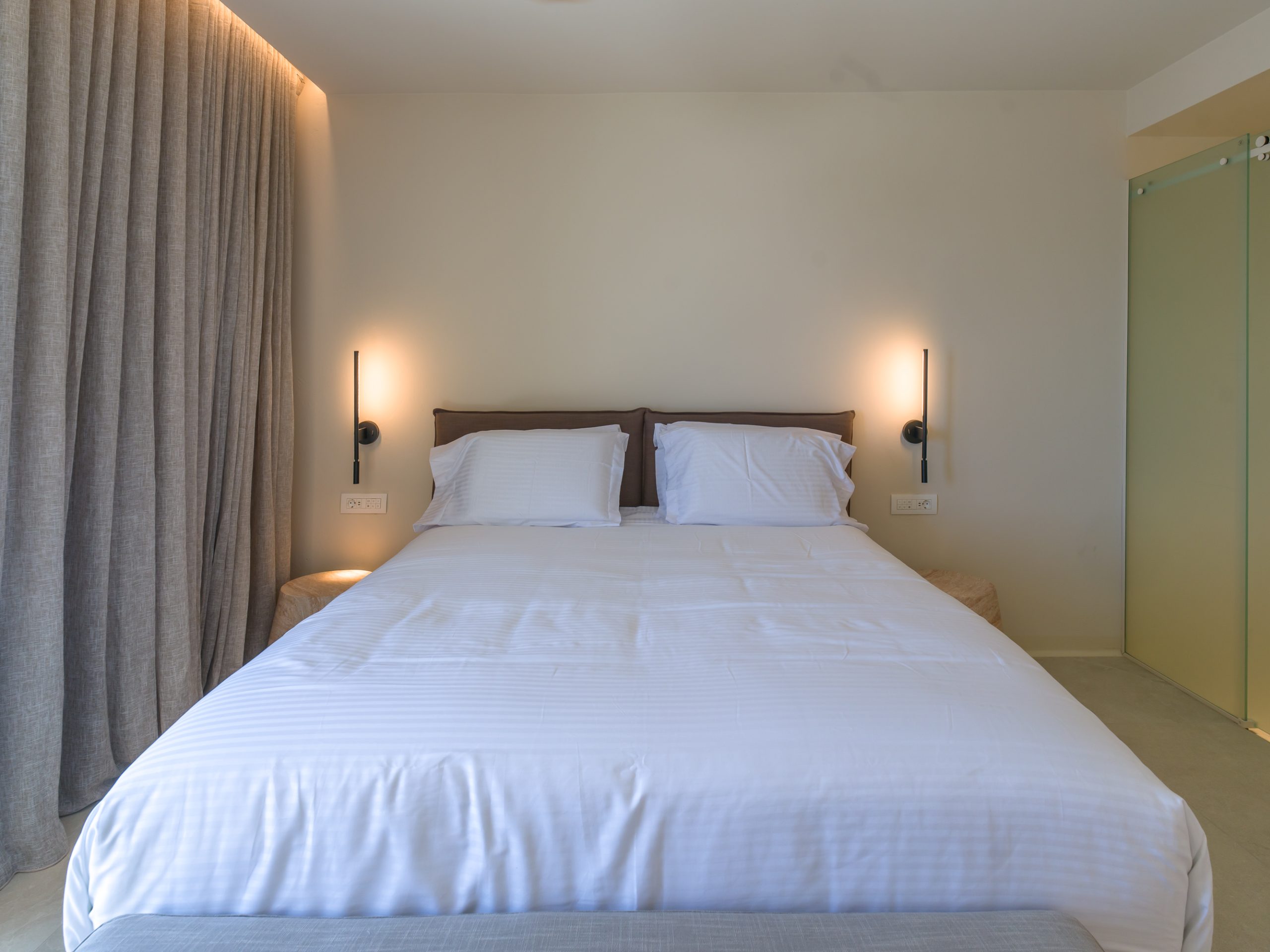 Inside, the Junior Suite features a comfortable double bed, a modern en-suite bathroom,— all carefully arranged to create a serene and welcoming space for two. Ideal for honeymoons, anniversaries, or romantic getaways, this suite offers a cozy sanctuary in the heart of Mykonos.